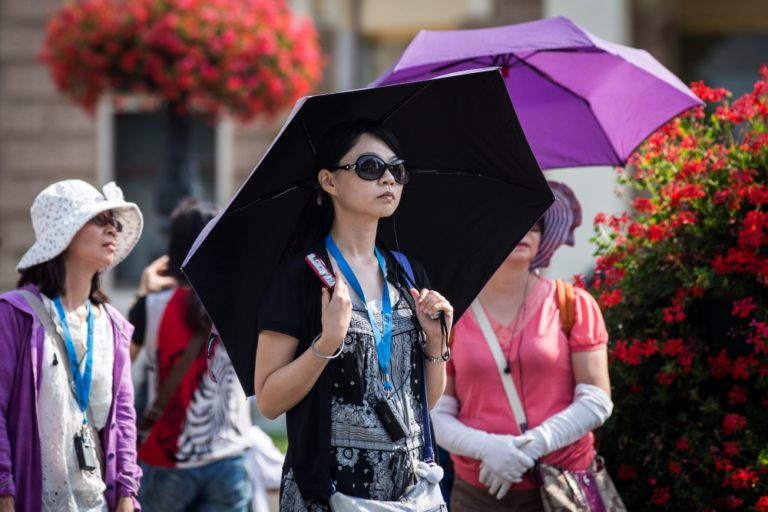 Turisti sa chránia pred vysokými teplotami dáždnikmi. V hlavnom meste môže byť v pondelok 34 až 36 stupňov Celzia. Bratislava, 21. júl 2014. Foto: SITA/Jozef Jakubčo