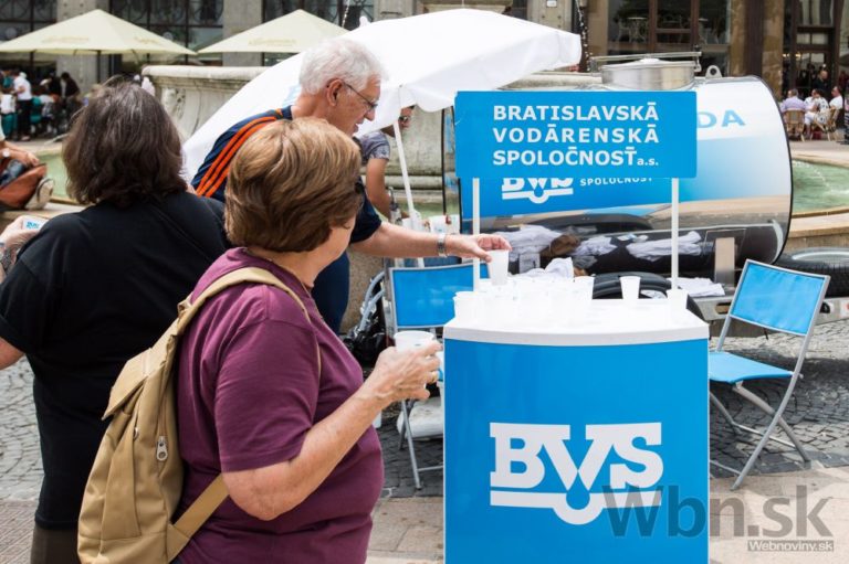 Cisterna s pitnou vodou na Hlavnom námestí v Bratislave. V Bratislave má byť v pondelok 34 až 36 stupňov Celzia. Bratislava, 21. júl 2014 Foto: SITA/Jozef Jakubčo