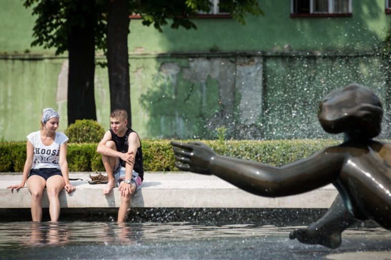 Mladý pár sa osviežuje vo fontáne. V hlavnom meste môže byť v pondelok 34 až 36 stupňov Celzia. Bratislava, 21. júl 2014. Foto: SITA/Jozef Jakubčo