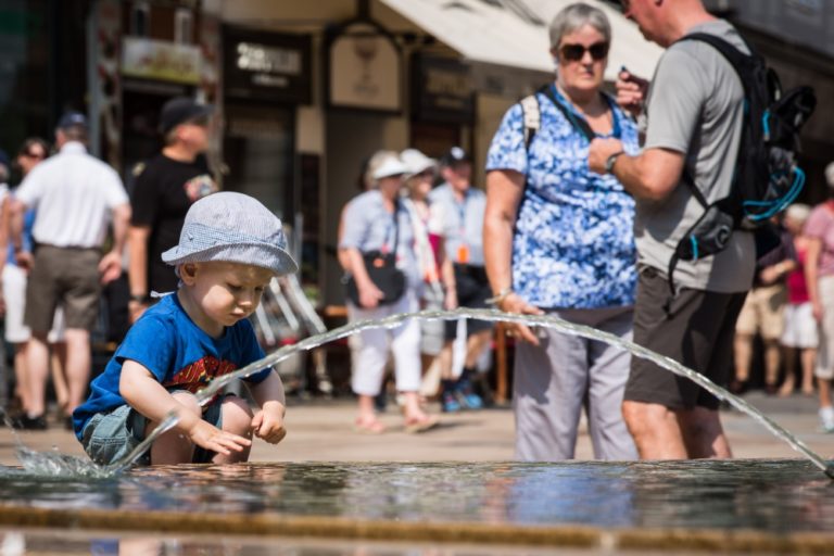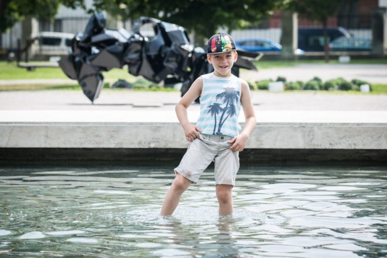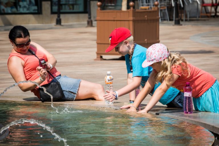 Deti sa osviežujú vo fontáne. V hlavnom meste môže byť v pondelok 34 až 36 stupňov Celzia. Bratislava, 21. júl 2014. Foto: SITA/Jozef Jakubčo