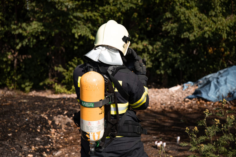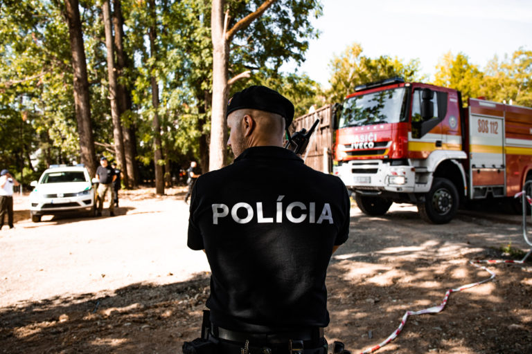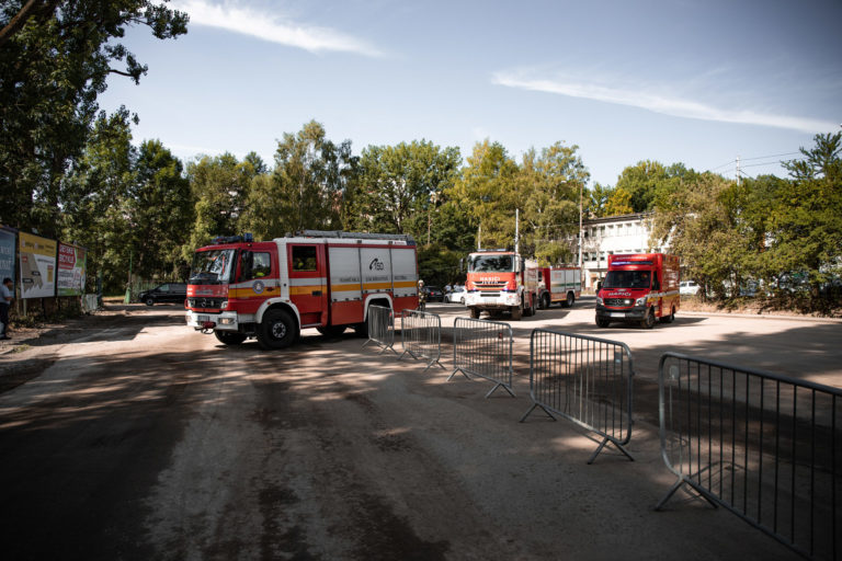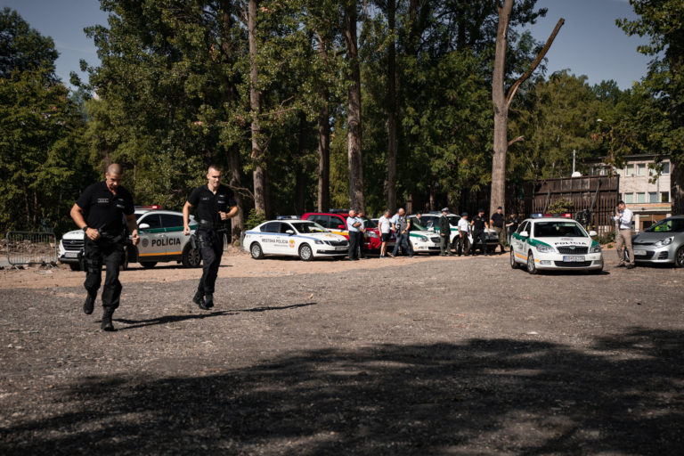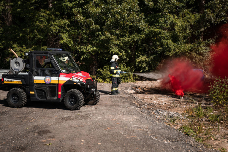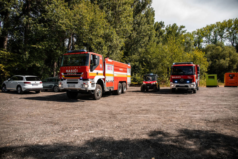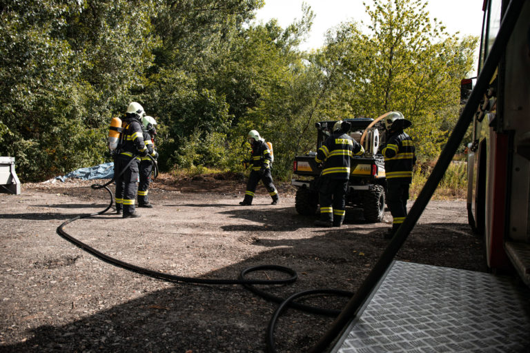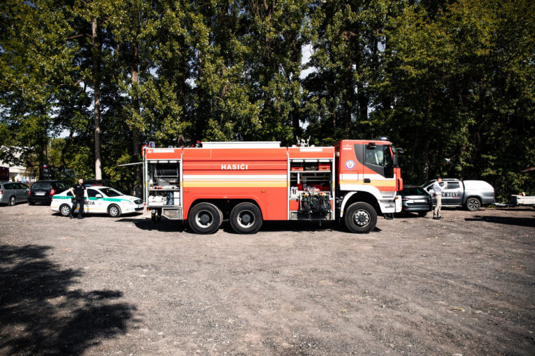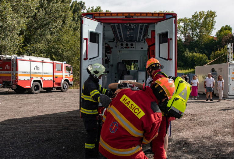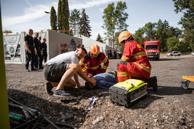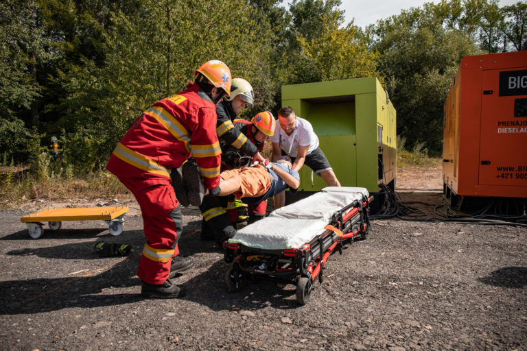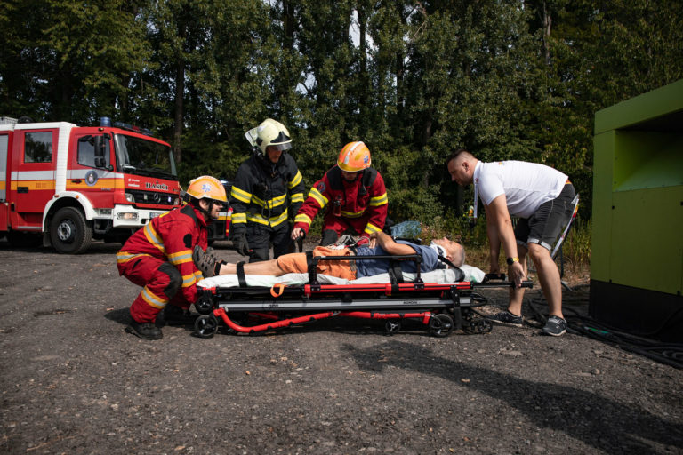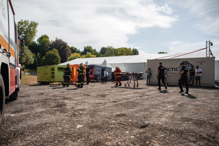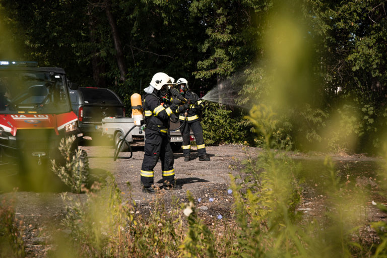 Cvičenie hasičského a záchranného zboru, policajného zboru, vojenskej polície, mestskej polície a zdravotnej a bezpečnostnej komisie EYOF v rácmi brífingu organizačného výboru EYOF Banská Bystrica 2022 v areáli plážového kúpaliska Aqualand v Banskej Bystrici pred začatím najväčšieho multišportového podujatia na Slovensku - Európsky olympijský festival mládeže (EYOF) Banská Bystrica 2022, ktorý sa uskutoční od 24. do 30. júla 2022. Bratislava, 18. júl 2022. Foto: SITA/EYOF