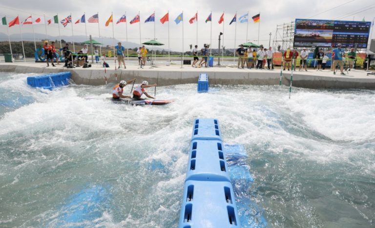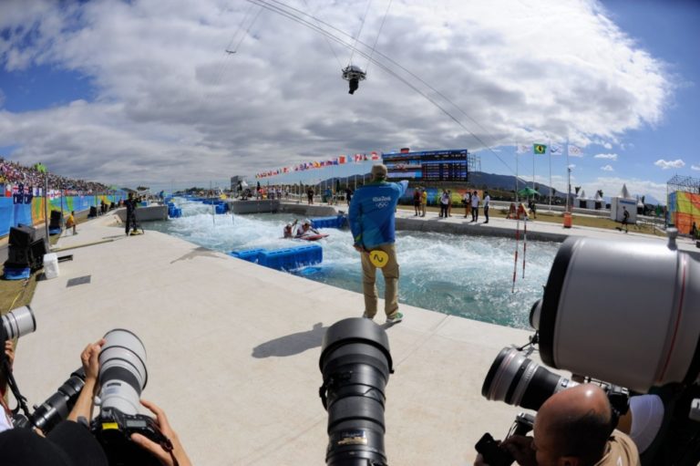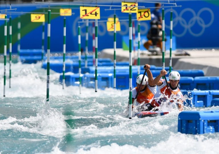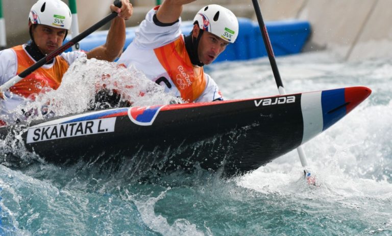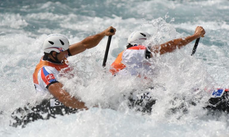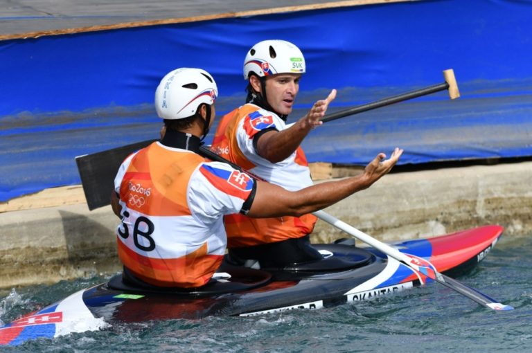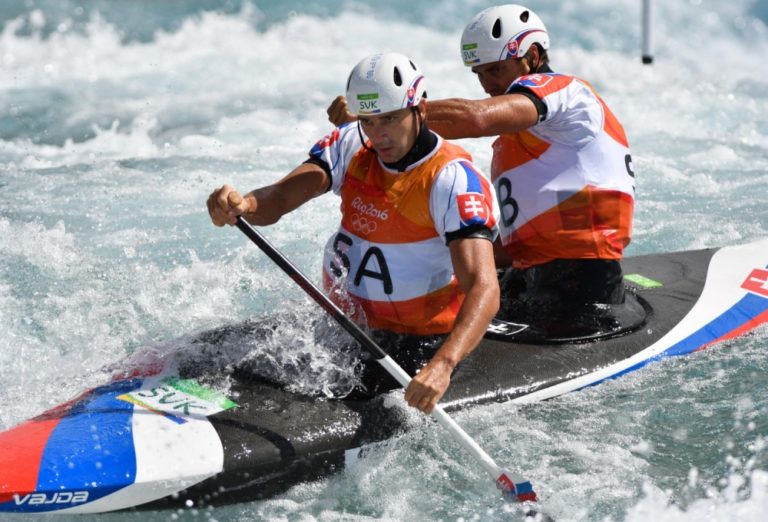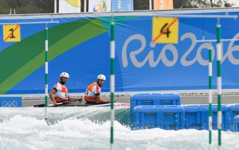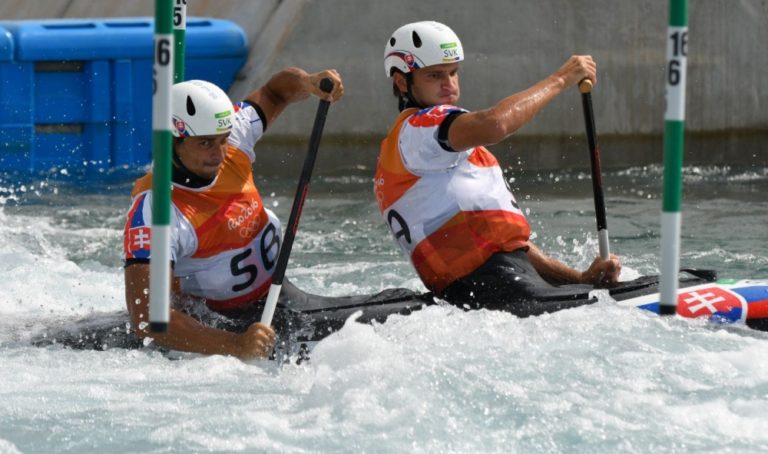 Slovenskí deblkanoisti Ladislav Škantár a Peter Škantár počas kvalifikácie disciplíny C2. Rio de Janeiro, 8. august 2016. Foto: SITA/Martin Medňanský