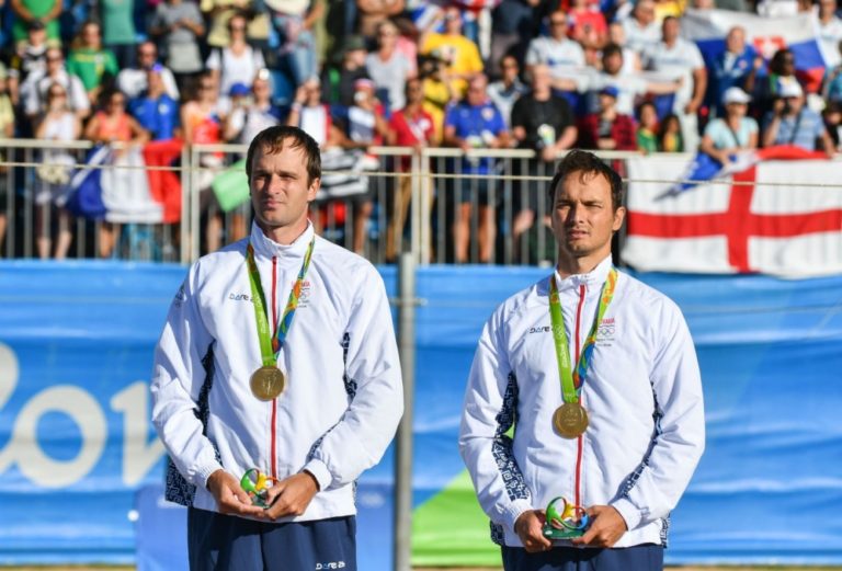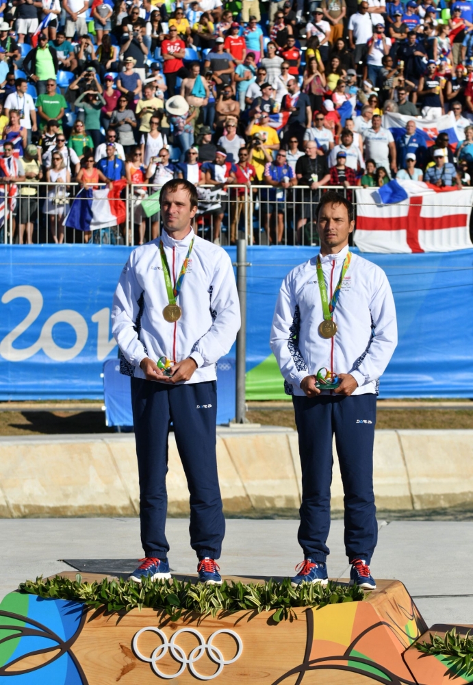 Zľava: Slovenskí deblkanoisti Ladislav Škantár a Peter Škantár so zlatou olympijskou medailou zdravia fanúšikov na letných OH 2016. Rio de Janeiro, 11. august 2016. Foto: SITA/Martin Medňanský