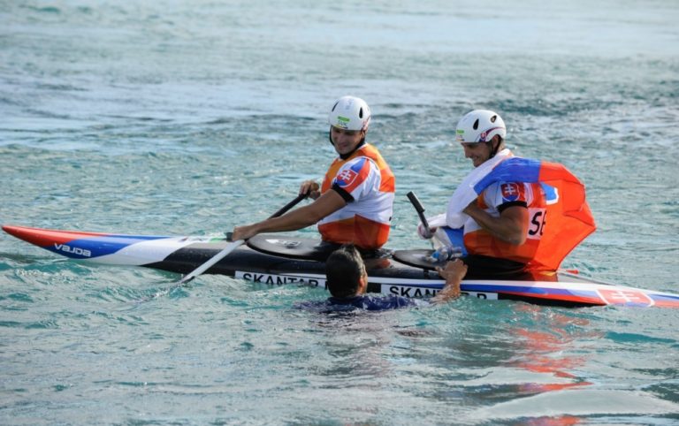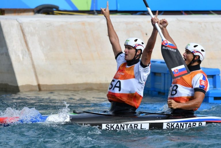 Slovenskí deblkanoisti Ladislav Škantár a Peter Škantár v cieli finálovej jazdy disciplíny C2. Rio de Janeiro, 11. august 2016. Foto: SITA/Martin Medňanský