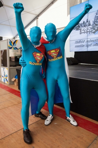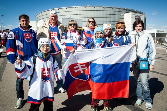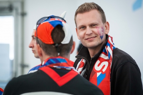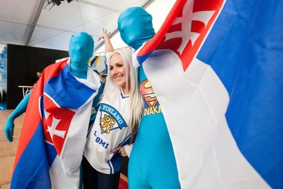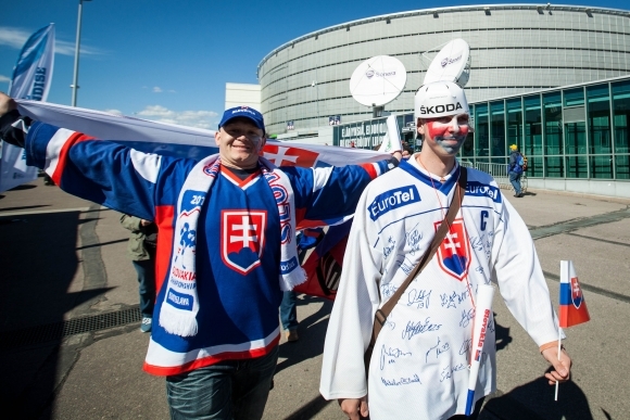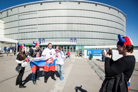 Fanúšikovia slovenskej hokejovej reprezentácie pred prvým zápasom slovenskej reprezentácie v základnej skupine majstrovstiev sveta v ľadovom hokeji 2013 vo Fínsku a Švédsku. Fínsko, Helsinki, 3. máj 2013. Foto: SITA/Jozef Jakubčo