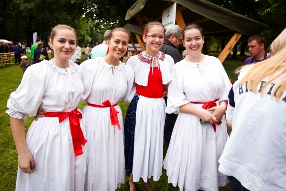 Aktérky sprievodných aktivít v ľudových krojoch počas Farmárskych trhov v Sade Janka Kráľa. Bratislava, 18. máj 2013. Foto: SITA/Diana Černáková