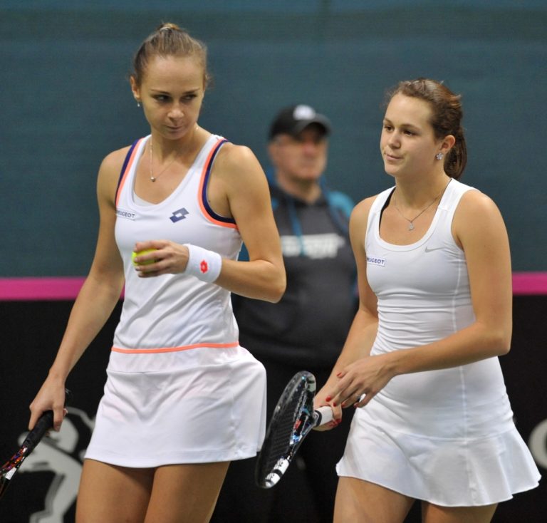 Slovenské reprezentantky Magdaléna Rybáriková (vľavo) a Jana Čepelová (vpravo) počas štvorhry s Nemkami Annou Lenou Grönefeldovou a Juliou Görgesovou v zápase štvrťfinále svetovej skupiny Pohára federácie BNP Paribas SR - Nemecko. Bratislava, 9. február 2014. Foto: SITA/Ján Slovák