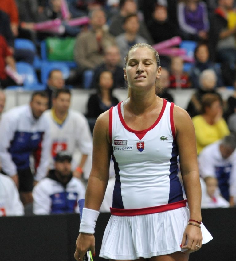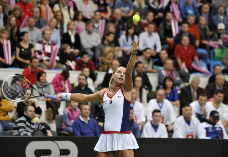 Slovenská reprezententka Dominika Cibulková počas duelu s Nemkou Angelique Kerberovou v zápase štvrťfinále svetovej skupiny Pohára federácie BNP Paribas SR - Nemecko. Bratislava, 9. február 2014. Foto: SITA/Ján Slovák