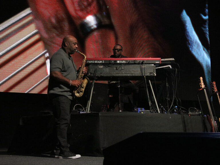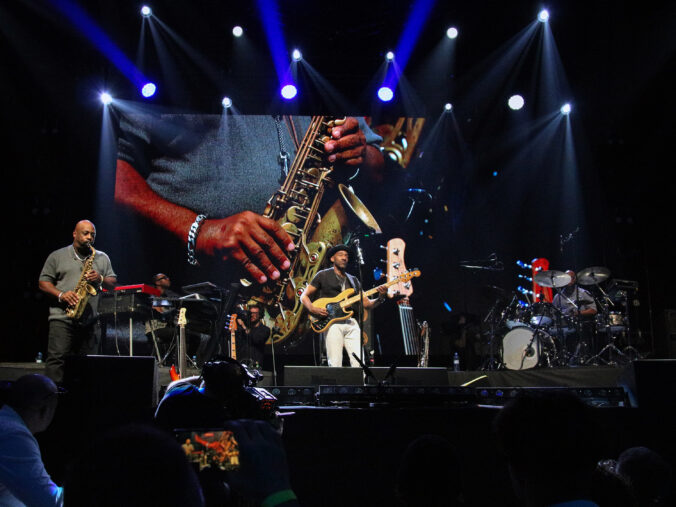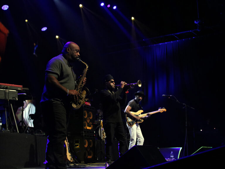 Zľava: Saxofonista Donald Hayes, trúbkar Russell Gunn a americký džezový hudobník a skladateľ, basgitarista Marcus Miller počas 50. ročníka festivalu Bratislavské jazzové dni 2025 v Inchebe. Bratislava, 25. október 2025. Foto: SITA/Andrea Mezeiová