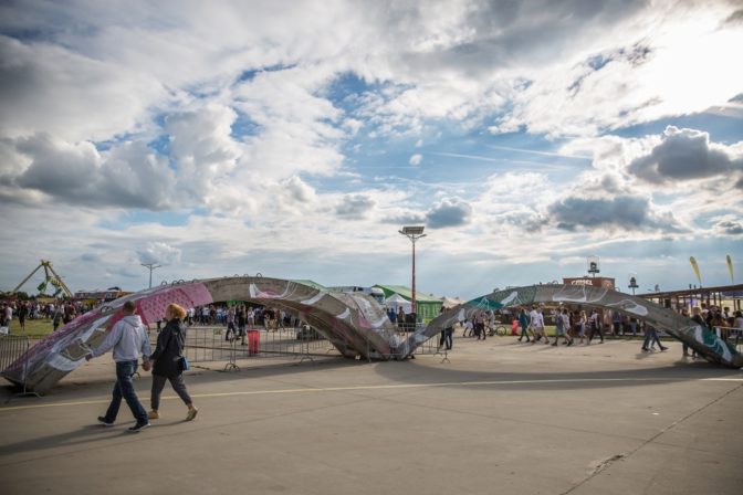 Inštalácia z kravát počas multižánrového hudobného festivalu Grape 2022 na trenčianskom letisku. Trenčín, 12. august 2022. Foto: SITA/Martin Medňanský.
