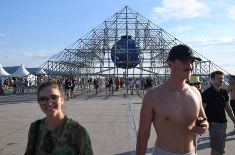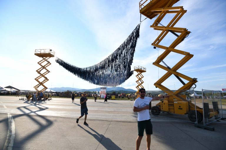 Inštalácia z kravát počas multižánrového hudobného festivalu Grape 2022 na trenčianskom letisku. Trenčín, 12. august 2022. Foto: SITA/Martin Medňanský