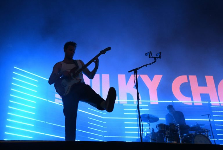 Zľava: Philipp Dausch - gitara a Sebastian Schmidt - bicie nástroje zo Skupiny Milky Chance (Nemecko) počas vystúpenia na hlavnom pódiu na Festivale Grape 2022 na trenčianskom letisku. Trenčín, 12. august 2022. Foto: SITA/Martin Medňanský