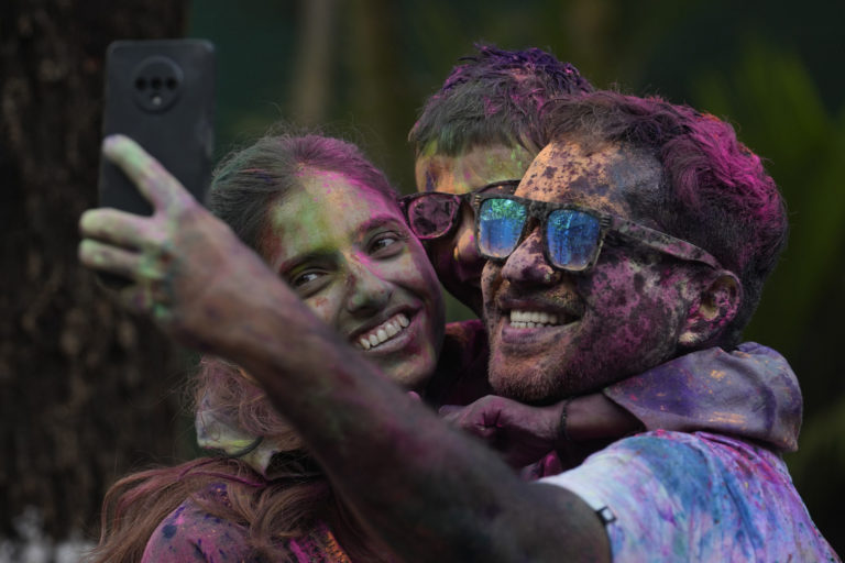Milióny Indov doma i po svete každoročne oslavujú sviatok Holi, známy aj ako festival farieb. Patrí medzi najpopulárnejšie sviatky, korým vítajú príchod jari, novej energie a tiež si pripomínajú víťazstvo dobra nad zlom. Bombaj, 25. marec 2024. Foto: SITA/AP.