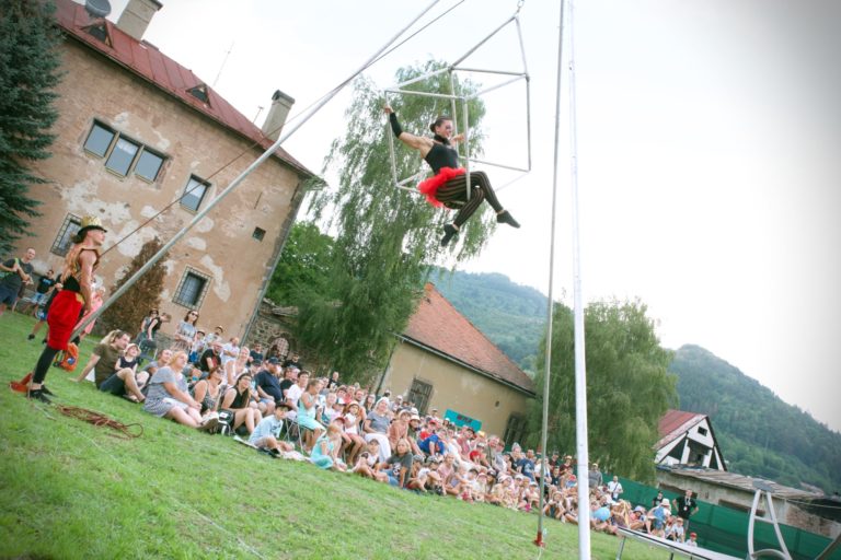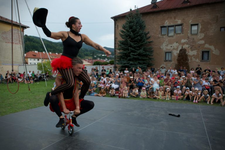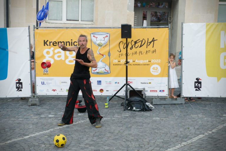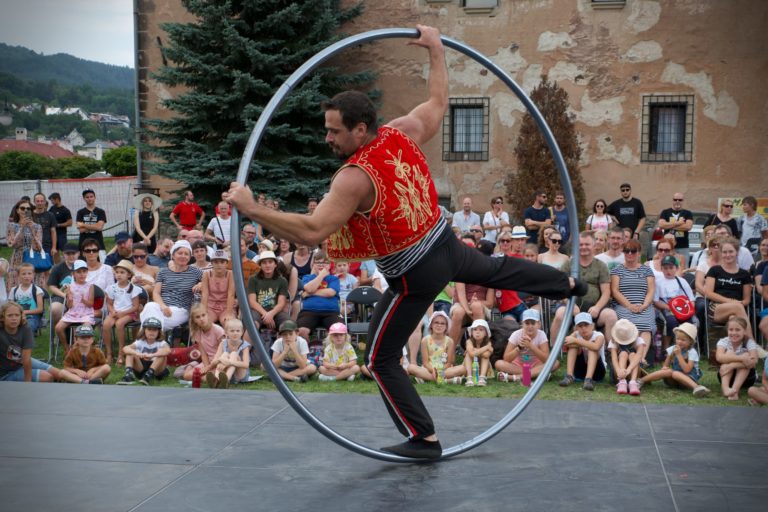 Akrobatické predstavenie počas 42. ročníka počas európskeho festivalu humoru a satiry Kremnické gagy v Kremnici. Foto: SITA/Jakub Julény