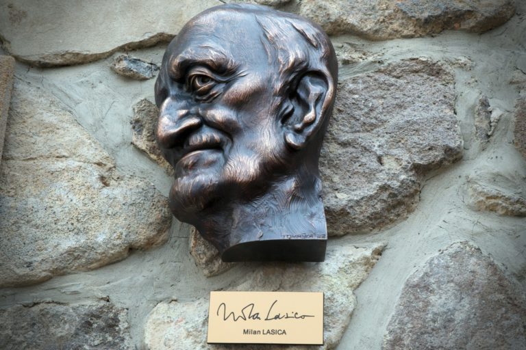Umelecký reliéf a pocta Milanovi Lasicovi v Uličke slávnych nosov počas 42. ročníka počas európskeho festivalu humoru a satiry Kremnické gagy v Kremnici. Foto: SITA/Jakub Julény