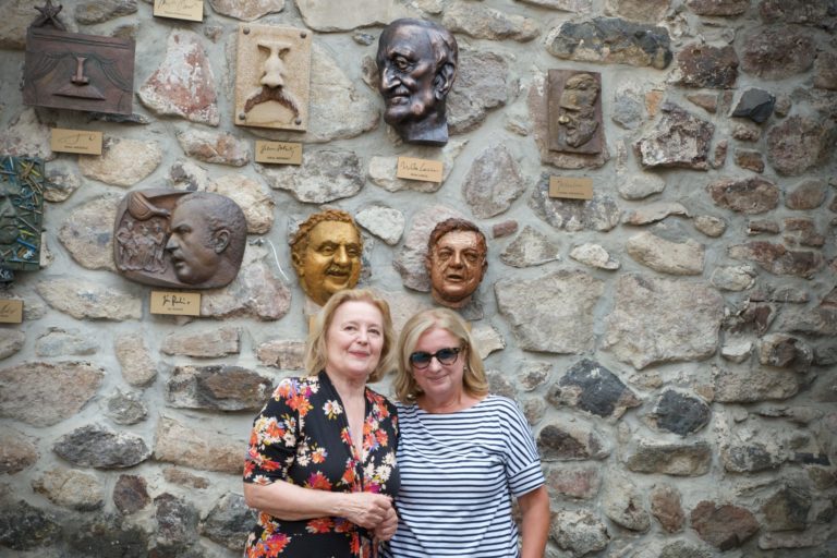 Zľava: Herečky Magda Vášáryová a Elena Vacvalová počas odhalenia umeleckého reliéfu (druhý sprava hore) a pocty Milanovi Lasicovi v Uličke slávnych nosov v rámci 42. ročníka počas európskeho festivalu humoru a satiry Kremnické gagy v Kremnici. Foto: SITA/Jakub Julény