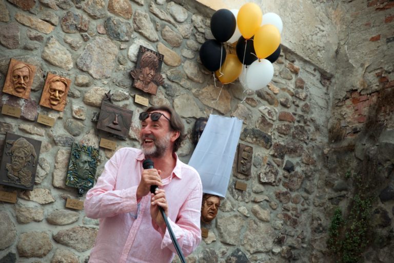 Herec Vladimír, alias Ady Hajdu počas odhalenia umeleckého reliéfu (vpravo) v Uličke slávnych nosov v rámci 42. ročníka počas európskeho festivalu humoru a satiry Kremnické gagy v Kremnici. Foto: SITA/Jakub Julény