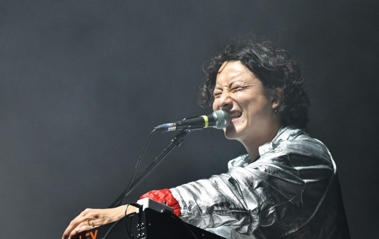 Hudobníčka Bolis Pupul z belgického dua Charlotte Adigéry & Bolis Pupul počas vystúpenia v rámci štvrtého dňa 26. ročníka multižánrového festivalu Pohoda na letisku v Trenčíne. Trenčín, 8. júl 2023. Foto: SITA/Martin Medňanský