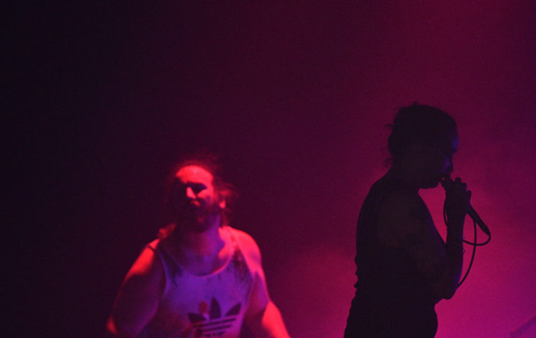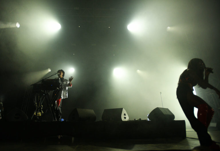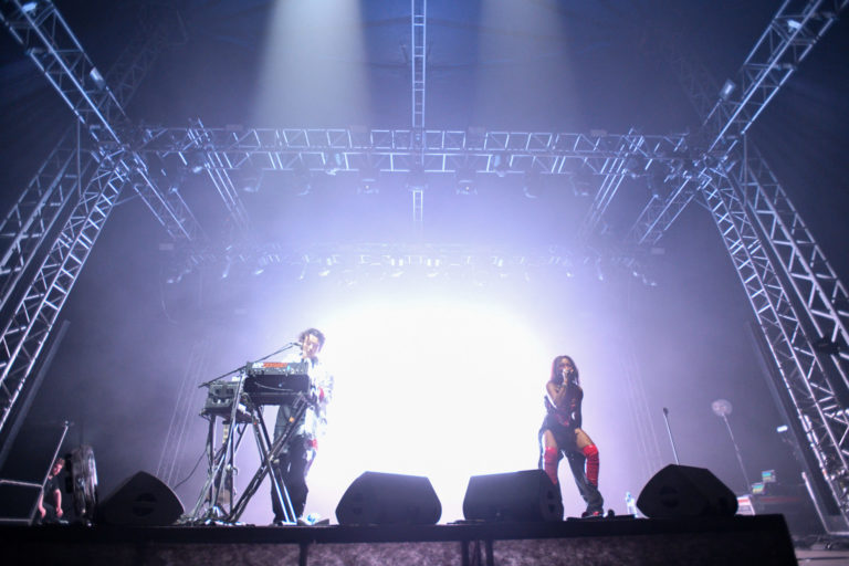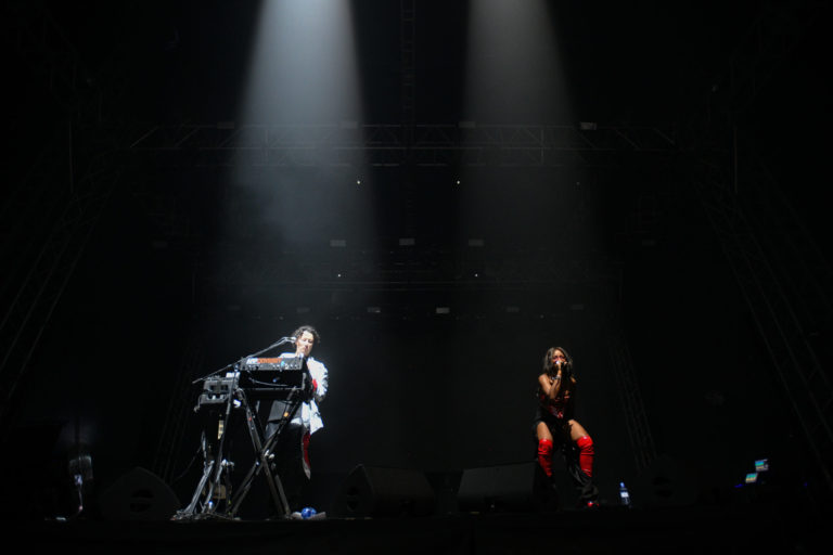 Belgické duo Charlotte Adigéry & Bolis Pupul počas vystúpenia v rámci štvrtého dňa 26. ročníka multižánrového festivalu Pohoda na letisku v Trenčíne. Trenčín, 8. júl 2023. Foto: SITA/Martin Medňanský
