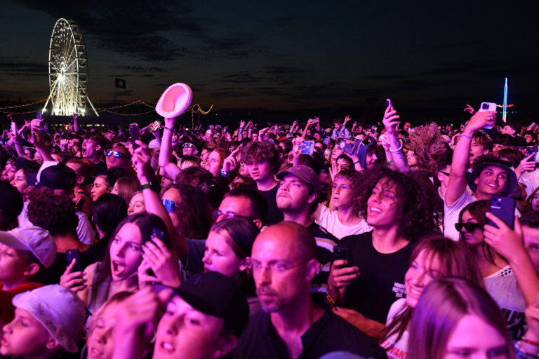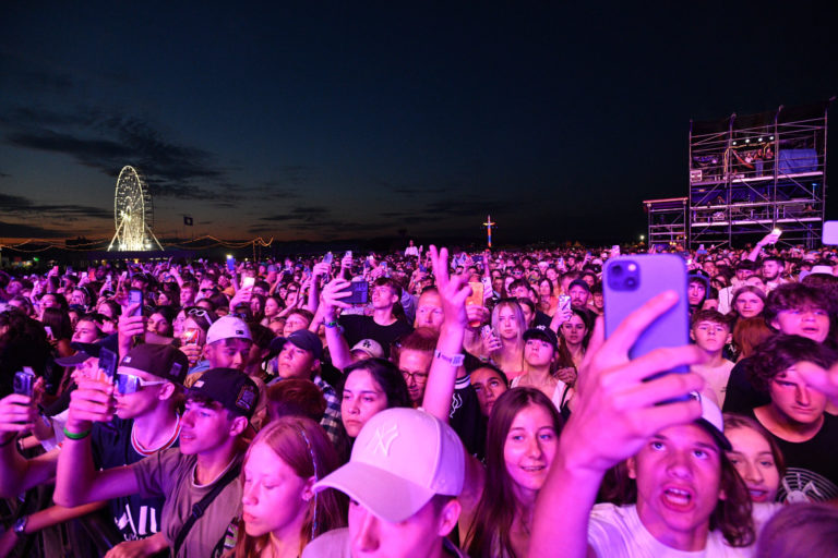 Fanúšikovia pod hlavným pódiom počas vystúpenia rapera Central Cee z Veľkej Británie v rámci štvrtého dňa 26. ročníka multižánrového festivalu Pohoda na letisku v Trenčíne. Trenčín, 8. júl 2023. Foto: SITA/Martin Medňanský
