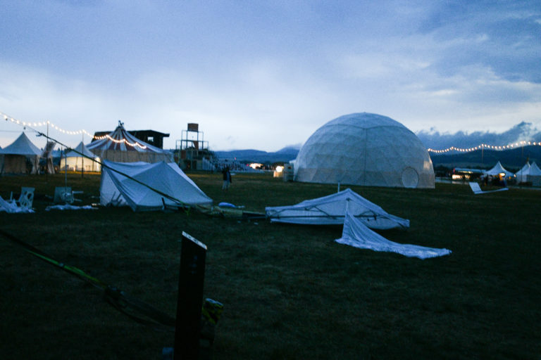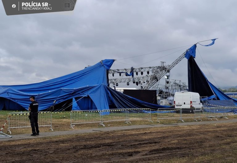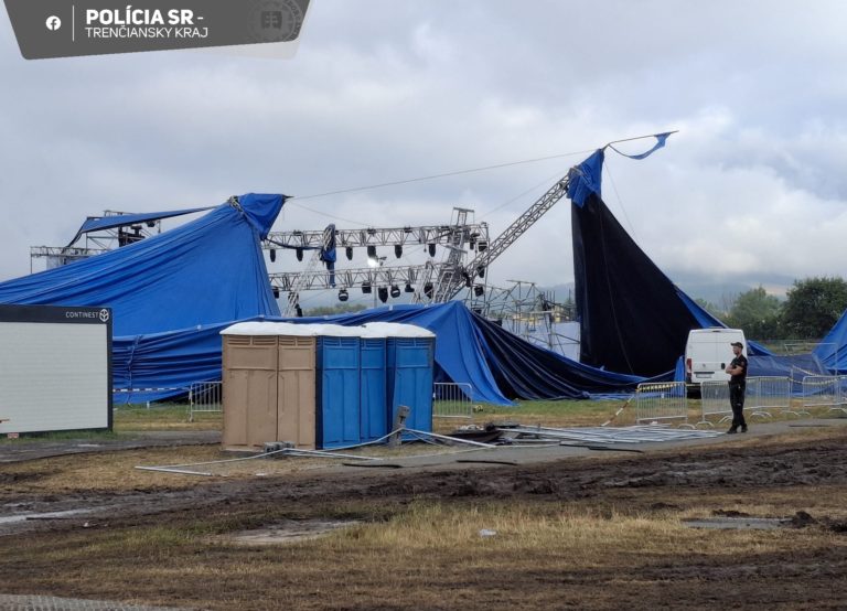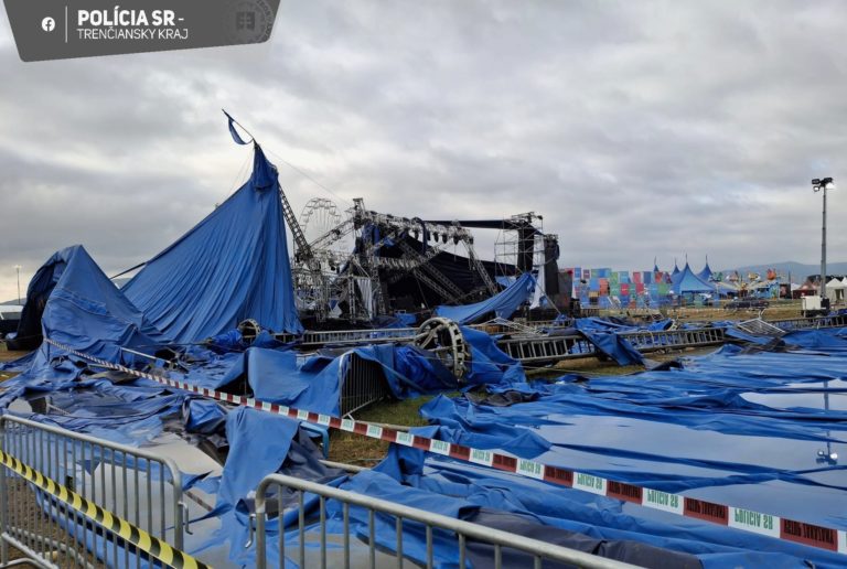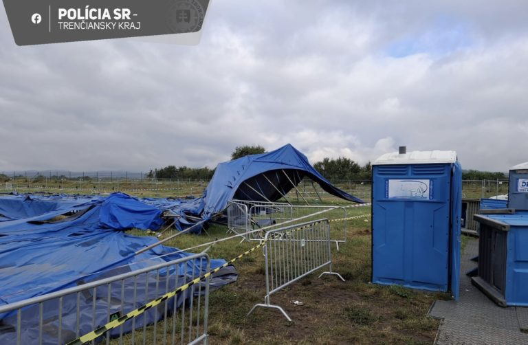 Pohľad na spadnutý stan po zrušení programu 27. ročníka multižánrového festivalu Pohoda. Trenčín, 13. júl 2024. Foto: SITA/Martin Medňanský.