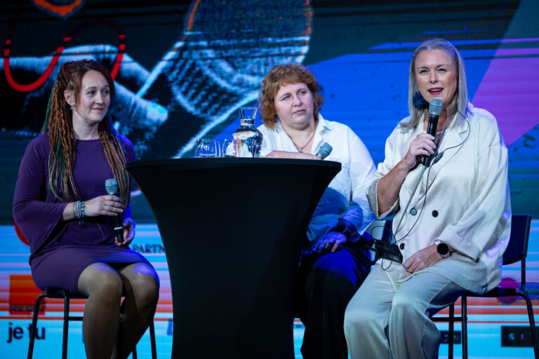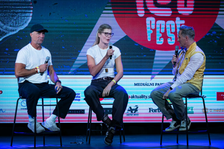 Zľava: Psychológ Aleš Bednařík, matchmakerka Diana Fabiánová a Kamil Aujeský počas festivalu RecFest v Edison Parku v Bratislave. Bratislava, 27. september 2025. Foto: SITA/Jana Birošová