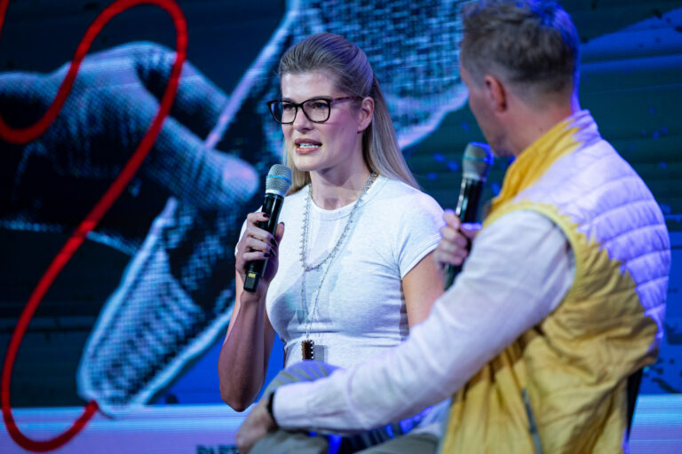 Zľava: Tréner Maroš Molnár, influencerka Dominika Krčmárikova a Matej "Sajfa" Cifra počas festivalu RecFest v Edison Parku v Bratislave. Bratislava, 27. september 2025. Foto: SITA/Jana Birošová