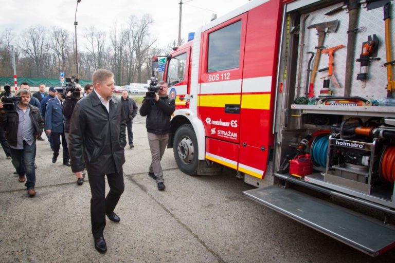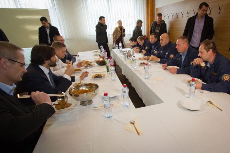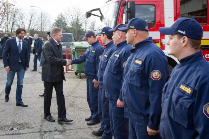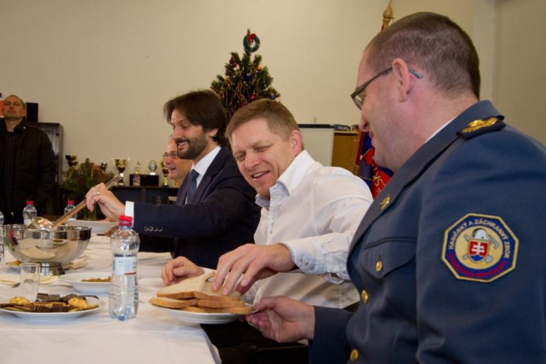 Premiér Robert Fico (v popredí) počas návštevy službukonajúcich hasičov stanice Hasičského a záchranného útvaru v Malackách. Malacky, 24. december 2015. Foto: SITA/Ľudovít Vaniher