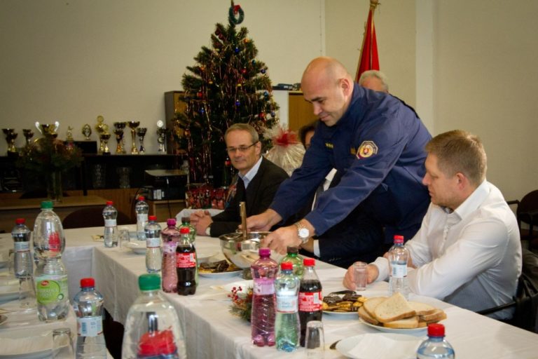 Premiér Robert Fico (vpravo) počas návštevy službukonajúcich hasičov stanice Hasičského a záchranného útvaru v Malackách. Malacky, 24. december 2015. Foto: SITA/Ľudovít Vaniher