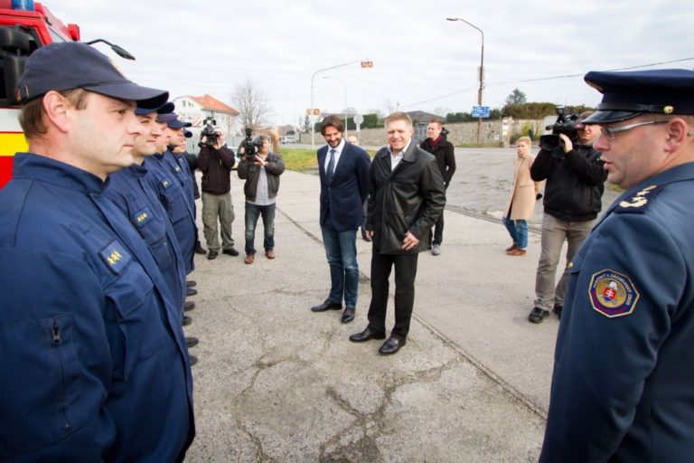 Zľava: Minister vnútra Robert Kaliňák (druhý) a premiér Robert Fico (tretí) počas návštevy službukonajúcich hasičov stanice Hasičského a záchranného útvaru v Malackách. Malacky, 24. december 2015. Foto: SITA/Ľudovít Vaniher