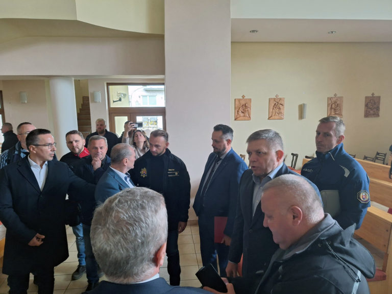 Predseda vlády Robert Fico (tretí sprava), minister vnútra SR Matúš Šutaj Eštok (piaty sprava) a minister práce, sociálnych vecí a rodiny SR Erik Tomáš počas pracovného výjazdu v Ďapalovciach, kde sa stretli so starostami obcí postihnutých zemetrasením. Ďapalovce, 3. november 2023. Foto: SITA/MV SR