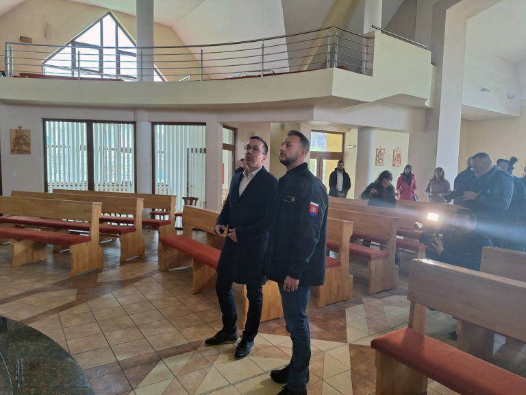 V popredí zľava: Minister práce, sociálnych vecí a rodiny SR Erik Tomáš a minister vnútra SR Matúš Šutaj Eštok si prezerajú škody po zemetrasení v dome smútku počas pracovného výjazdu ministrov a predsedu vlády SR v Ďapalovciach, kde sa stretli so starostami obcí postihnutých zemetrasením. Ďapalovce, 3. november 2023. Foto: SITA/MV SR