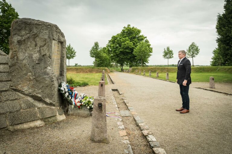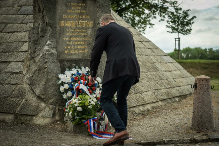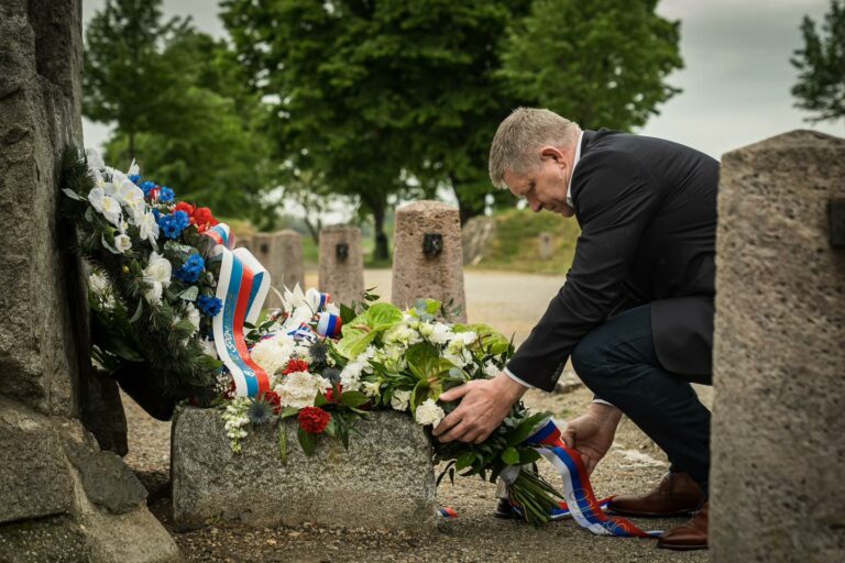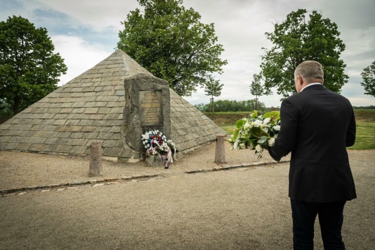 Premiér SR Robert Fico počas položenia venca v rámci spomienky na 106. výročie úmrtia gen. Milana Rastislava Štefánika pri pamätníku Milana Rastislava Štefánika v Ivanke pri Dunaji. Bratislava, 4. máj 2025. Foto: SITA/Úrad vlády SR