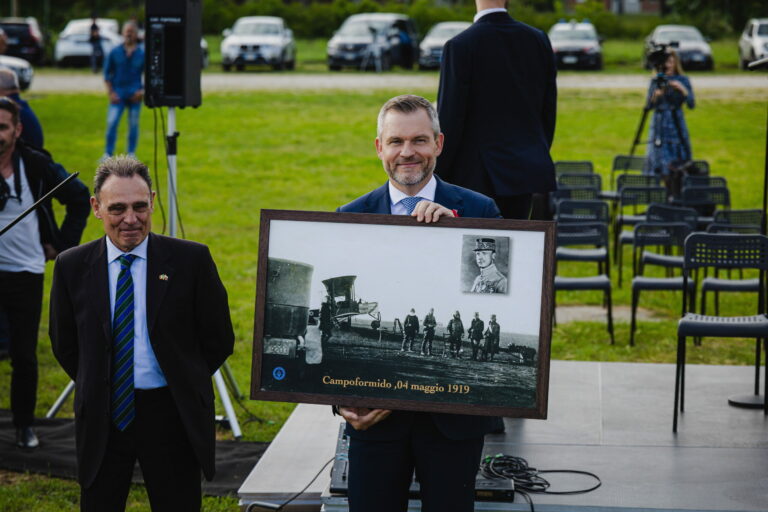 Prezident SR Peter Pellegrini (vpravo) počas pietnej spomienky v talianskom meste Campoformido, odkiaľ generál Štefánik 4. mája 1919 vzlietol na svoj posledný let do vlasti v rámci spomienky na 106. výročie úmrtia generála Milana Rastislava Štefánika. Taliansko, Campoformido, 4. máj 2025. Foto: SITA/Kancelária prezidenta