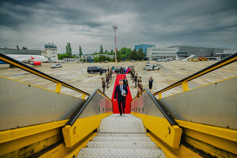 Prezident SR Peter Pellegrini (v popredí) nastupuje do lietadla po pietnej spomienke v talianskom meste Campoformido, odkiaľ generál Štefánik 4. mája 1919 vzlietol na svoj posledný let do vlasti v rámci spomienky na 106. výročie úmrtia generála Milana Rastislava Štefánika. Taliansko, Campoformido, 4. máj 2025. Foto: SITA/Kancelária prezidenta