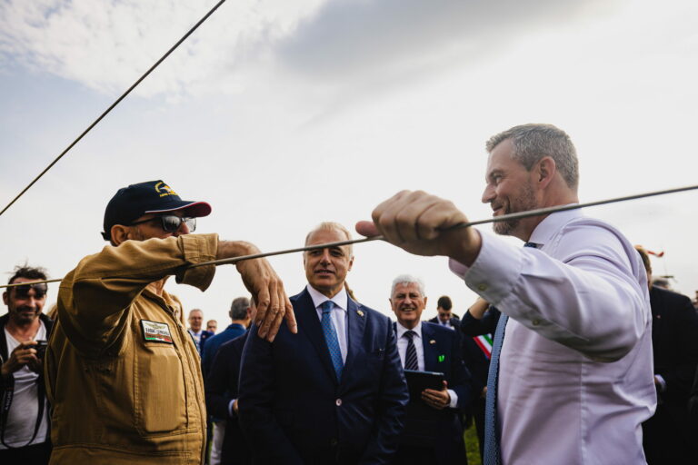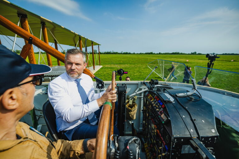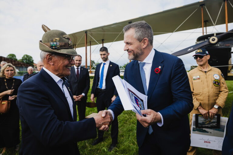 Prezident SR Peter Pellegrini (vpravo) počas historickej rekonštrukcie tragického letu pripraveného Nadáciou Jonathan Collection na letisku Campoformido, odkiaľ generál Štefánik 4. mája 1919 vzlietol na svoj posledný let do vlasti v rámci spomienky na 106. výročie úmrtia generála Milana Rastislava Štefánika. Taliansko, Campoformido, 4. máj 2025. Foto: SITA/Kancelária prezidenta