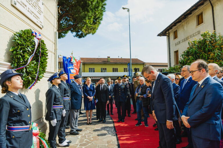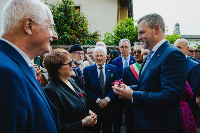 Prezident SR Peter Pellegrini počas pietnej spomienky v talianskom meste Campoformido, odkiaľ generál Štefánik 4. mája 1919 vzlietol na svoj posledný let do vlasti v rámci spomienky na 106. výročie úmrtia generála Milana Rastislava Štefánika. Taliansko, Campoformido, 4. máj 2025. Foto: SITA/Kancelária prezidenta