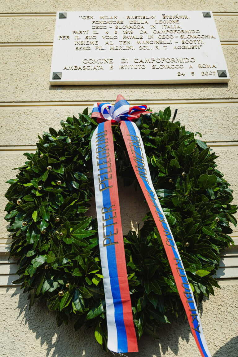 Veniec venovaný prezidentom SR počas pietnej spomienky v talianskom meste Campoformido, odkiaľ generál Štefánik 4. mája 1919 vzlietol na svoj posledný let do vlasti v rámci spomienky na 106. výročie úmrtia generála Milana Rastislava Štefánika. Taliansko, Campoformido, 4. máj 2025. Foto: SITA/Kancelária prezidenta