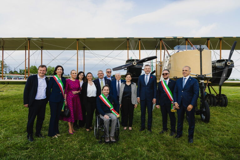 Prezident SR Peter Pellegrini (tretí sprava) počas historickej rekonštrukcie tragického letu pripraveného Nadáciou Jonathan Collection na letisku Campoformido, odkiaľ generál Štefánik 4. mája 1919 vzlietol na svoj posledný let do vlasti v rámci spomienky na 106. výročie úmrtia generála Milana Rastislava Štefánika. Taliansko, Campoformido, 4. máj 2025. Foto: SITA/Kancelária prezidenta