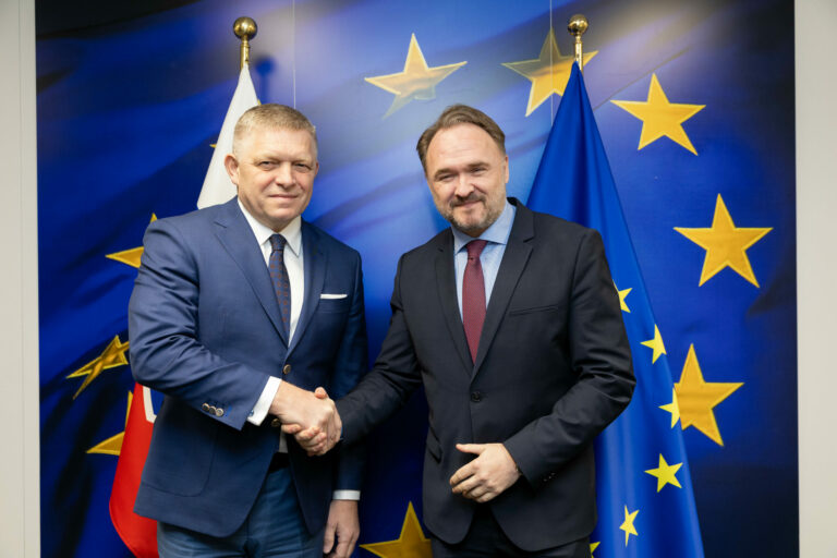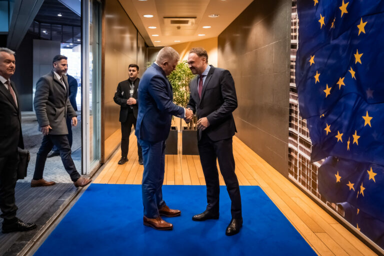 Zľava: Predseda vlády SR Robert Fico a eurokomisár pre energetiku a bývanie Dan Jørgensen počas stretnutia s predstaviteľmi Európskej komisie v Bruseli. Brusel, Belgicko, 9. január 2025. Foto: SITA/© Európska únia, 2025, CC BY 4.0