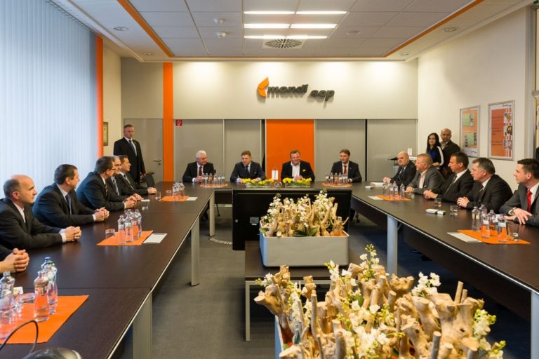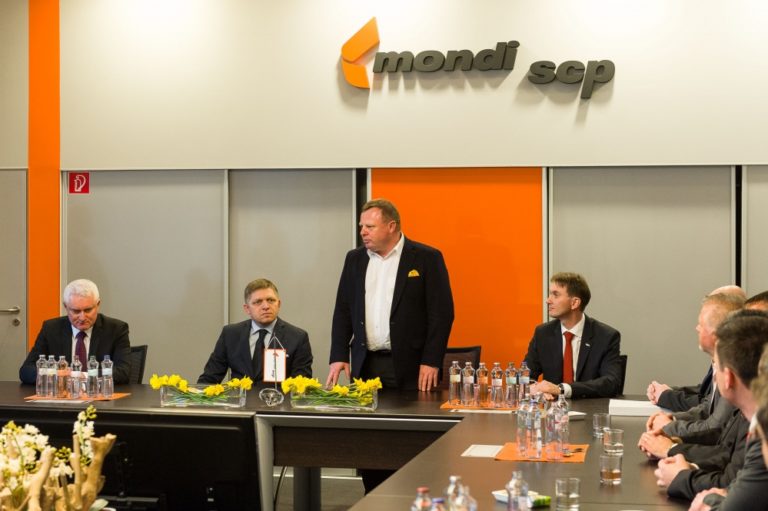 Premiér Robert Fico (druhý zľava), Miroslav Čurilla, predseda predstavenstva Mondi SCP (vľavo), Milan Fiľo, predseda predstavenstva Ecoinvest (tretí zľava) a Roman Senecký, prezident Mondi SCP (vpravo) počas stretnutia s vedením papierní Mondi SCP v Ružomberku. Ružomberok, 16. marec 2014. Foto: SITA/Milo Fabian