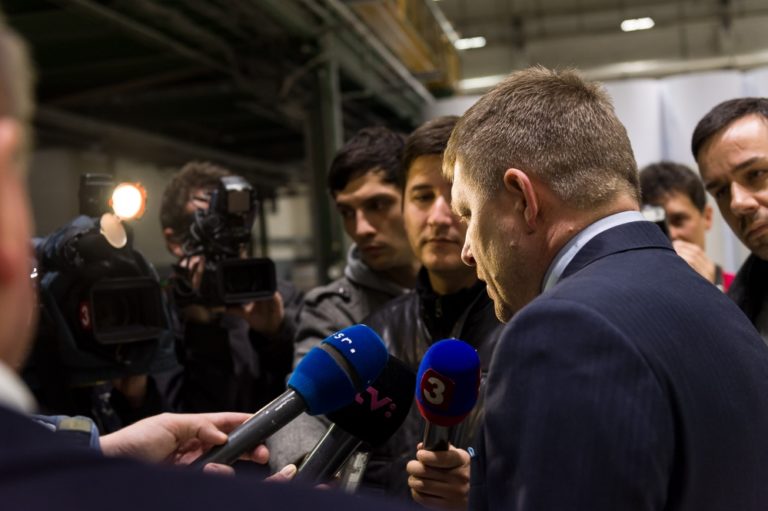 Premiér Robert Fico počas brífingu po stretnutí so zamestnancami papierní v hale Mondi SCP v Ružomberku. Ružomberok, 16. marec 2014. Foto: SITA/Milo Fabian