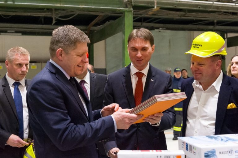 Premiér Robert Fico (druhý vpravo) a Roman Senecký, prezident Mondi SCP (vpravo) počas stretnutia so zamestnancami papierní v novej hale úpravovne Mondi SCP v Ružomberku. Ružomberok, 16. marec 2014. Foto: SITA/Milo Fabian