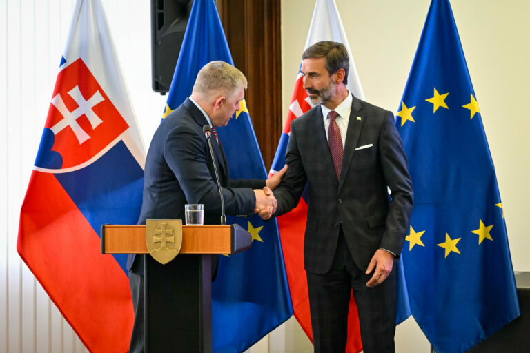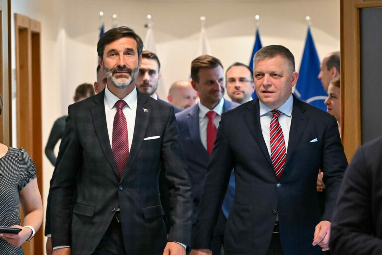 Zľava: Predseda vlády SR Robert Fico a minister zahraničných vecí a európskych záležitostí SR Juraj Blanár počas návštevy Ministerstva zahraničných vecí a európskych záležitostí SR premiérom SR v rámci série pracovných návštev na ministerstvách. Bratislava, 28. máj 2025. Foto: archívne, SITA/MZV