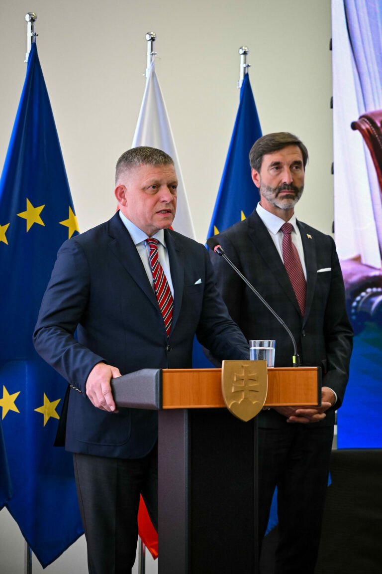 Zľava: Predseda vlády SR Robert Fico a minister zahraničných vecí a európskych záležitostí SR Juraj Blanár počas návštevy Ministerstva zahraničných vecí a európskych záležitostí SR premiérom SR v rámci série pracovných návštev na ministerstvách. Bratislava, 28. máj 2025. Foto: SITA/MZV