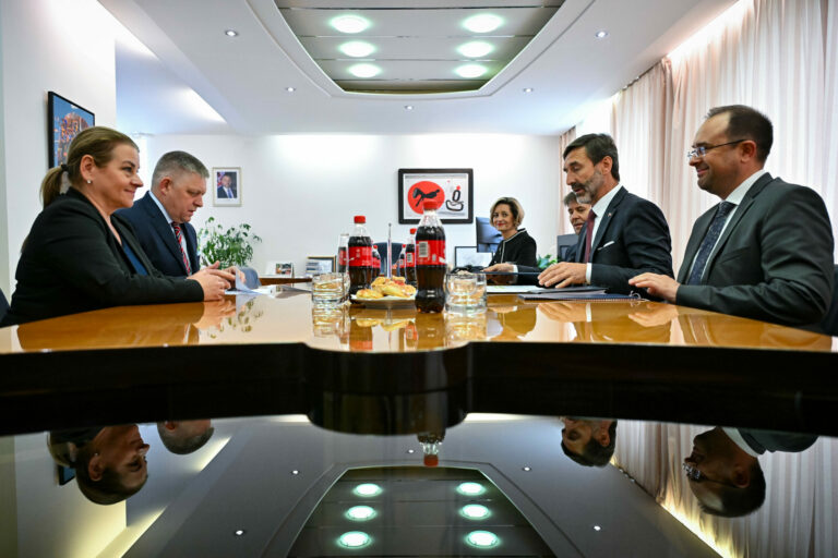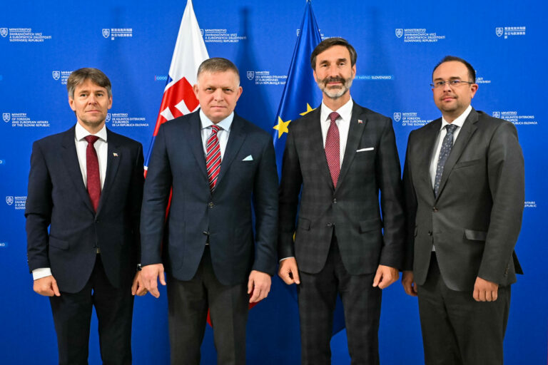 Zľava: Štátny tajomník MZVEZ Marek Eštok, predseda vlády SR Robert Fico a minister zahraničných vecí a európskych záležitostí SR Juraj Blanár a štátny tajomník MZVEZ Rastislav Chovanec počas návštevy Ministerstva zahraničných vecí a európskych záležitostí SR premiérom SR v rámci série pracovných návštev na ministerstvách. Bratislava, 28. máj 2025. Foto: SITA/MZV