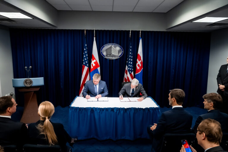 Predseda vlády Slovenskej republiky Robert Fico (v pozadí vľavo) počas podpisu dohody o spolupráci medzi vládou Slovenska a Spojených štátov amerických (USA) v oblasti civilnej jadrovej energetiky, ktorý sa uskutočnil v priestoroch Ministerstva energetiky USA. Washington, USA, 16. január 2026. Foto: SITA/Úrad vlády SR