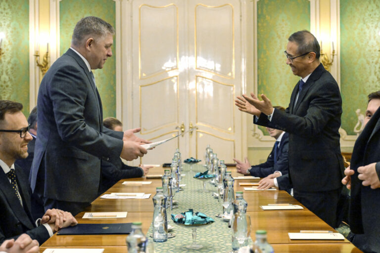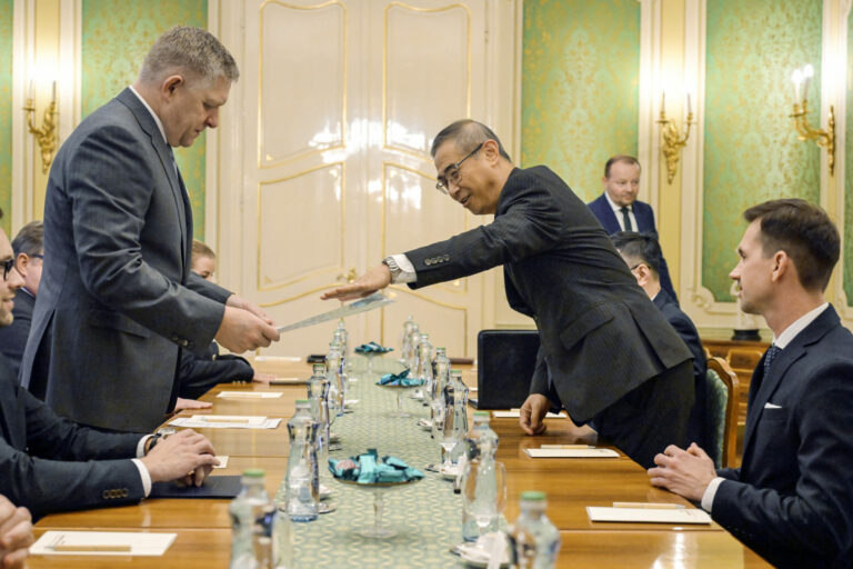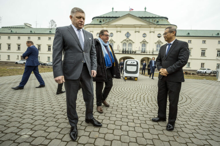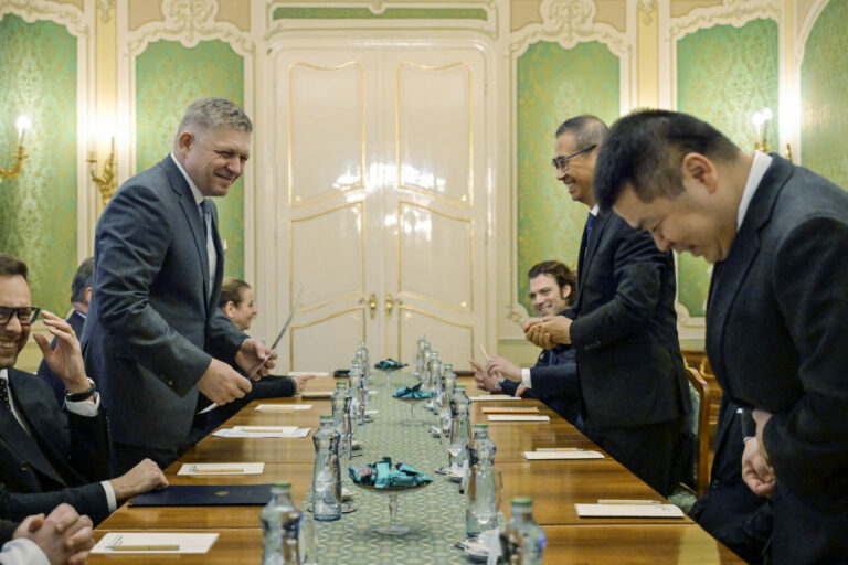 Predseda vlády SR Robert Fico (vľavo v pozadí) počas prijatia predstaviteľov spoločnosti Gotion InoBat Batteries v Zelenom salóniku v historickej budove Úradu vlády SR. Spoločnosť Gotion InoBat Batteries darovala mobilnú nabíjacu stanicu predsedovi vlády SR Robertovi Ficovi ako dar v rámci jeho návštevy závodu Gotion v Číne. Bratislava, 26. február 2025. Foto: SITA/Milan Illík