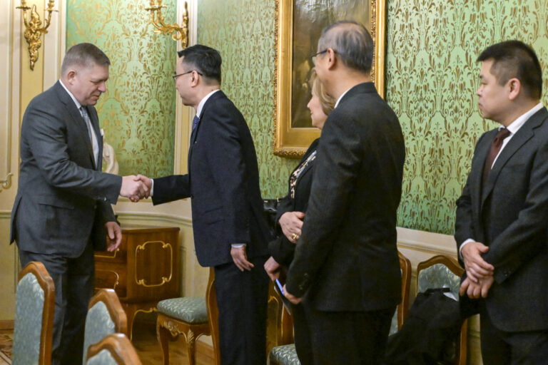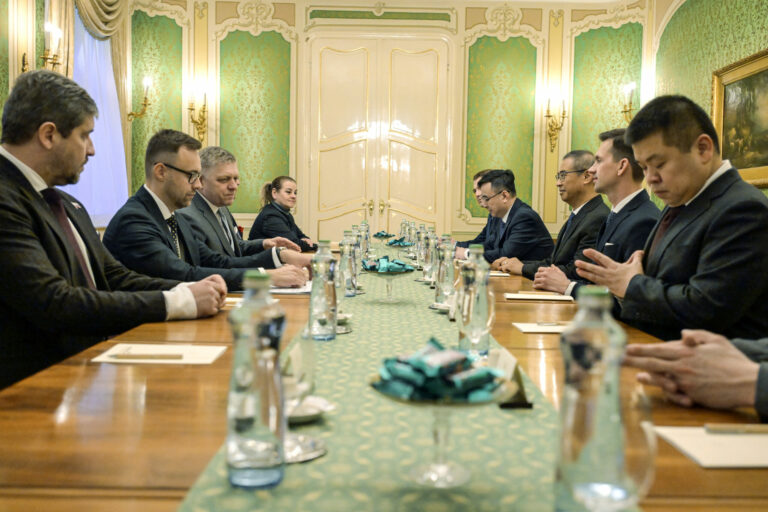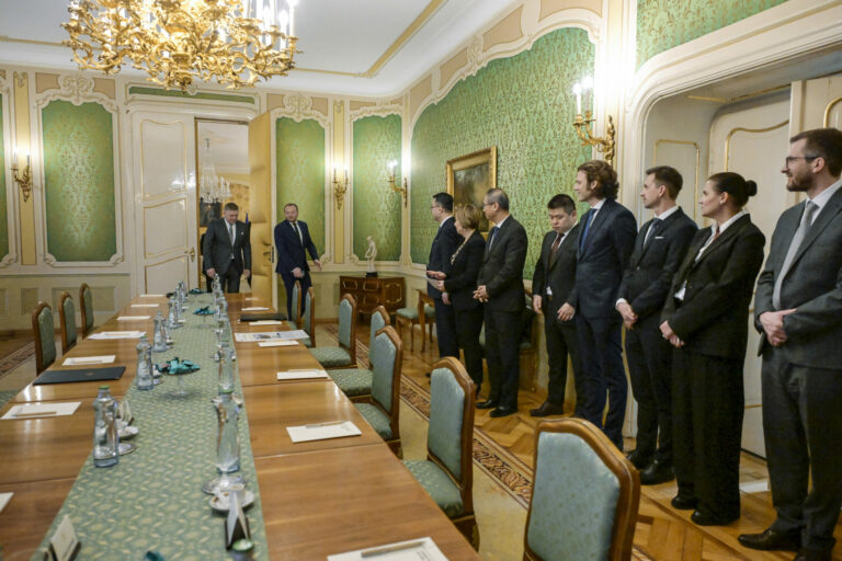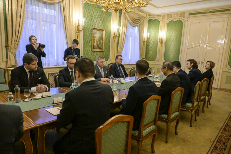 Predseda vlády SR Robert Fico (druhý sprava v pozadí) a predseda predstavenstva spoločnosti Gotion InoBat Batteries a prezident Gotion EMEA Steven Cai (štvrtý sprava) počas prijatia predstaviteľov spoločnosti Gotion InoBat Batteries v Zelenom salóniku v historickej budove Úradu vlády SR. Spoločnosť Gotion InoBat Batteries darovala mobilnú nabíjacu stanicu predsedovi vlády SR Robertovi Ficovi ako dar v rámci jeho návštevy závodu Gotion v Číne. Bratislava, 26. február 2025. Foto: SITA/Milan Illík