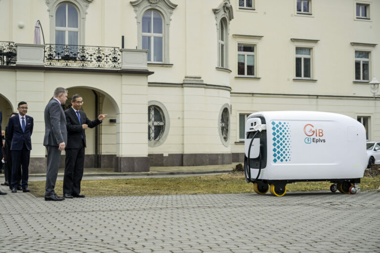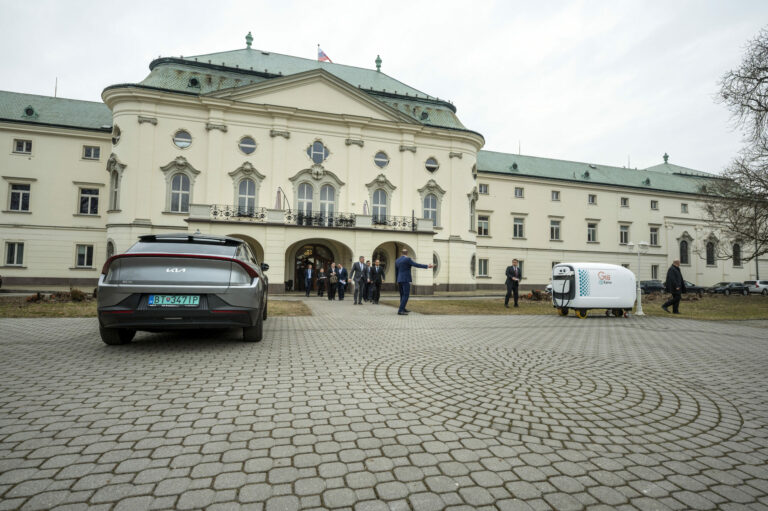 Atmosféra pred prezentáciou mobilnej nabíjacej stanice v záhrade Úradu vlády SR, ktorú premiér SR dostal ako dar v rámci jeho návštevy závodu Gotion v Číne po prijatí predstaviteľov spoločnosti Gotion InoBat Batteries predsedom vlády SR v historickej budove Úradu vlády SR. Bratislava, 26. február 2025. Foto: SITA/Milan Illík